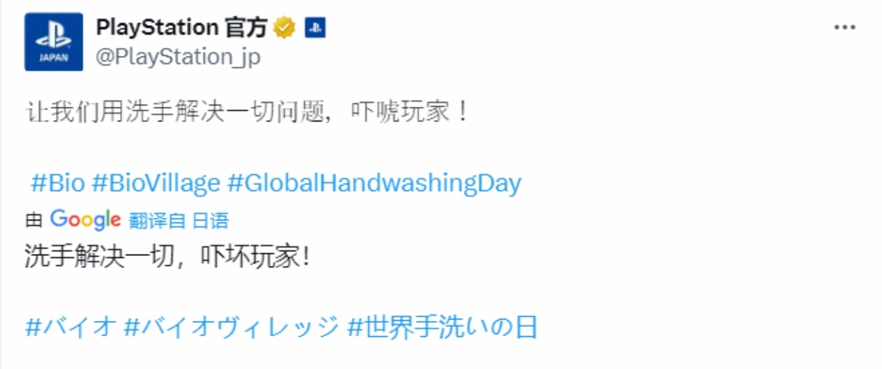 10月15日世界洗手日,PlayStation日本官方账号发布了一张《生化危机7》中主角伊森·温特斯的经典手部特写图片,并配文“洗手可以解决一切问题”,以独特方式响应这一卫生倡议。