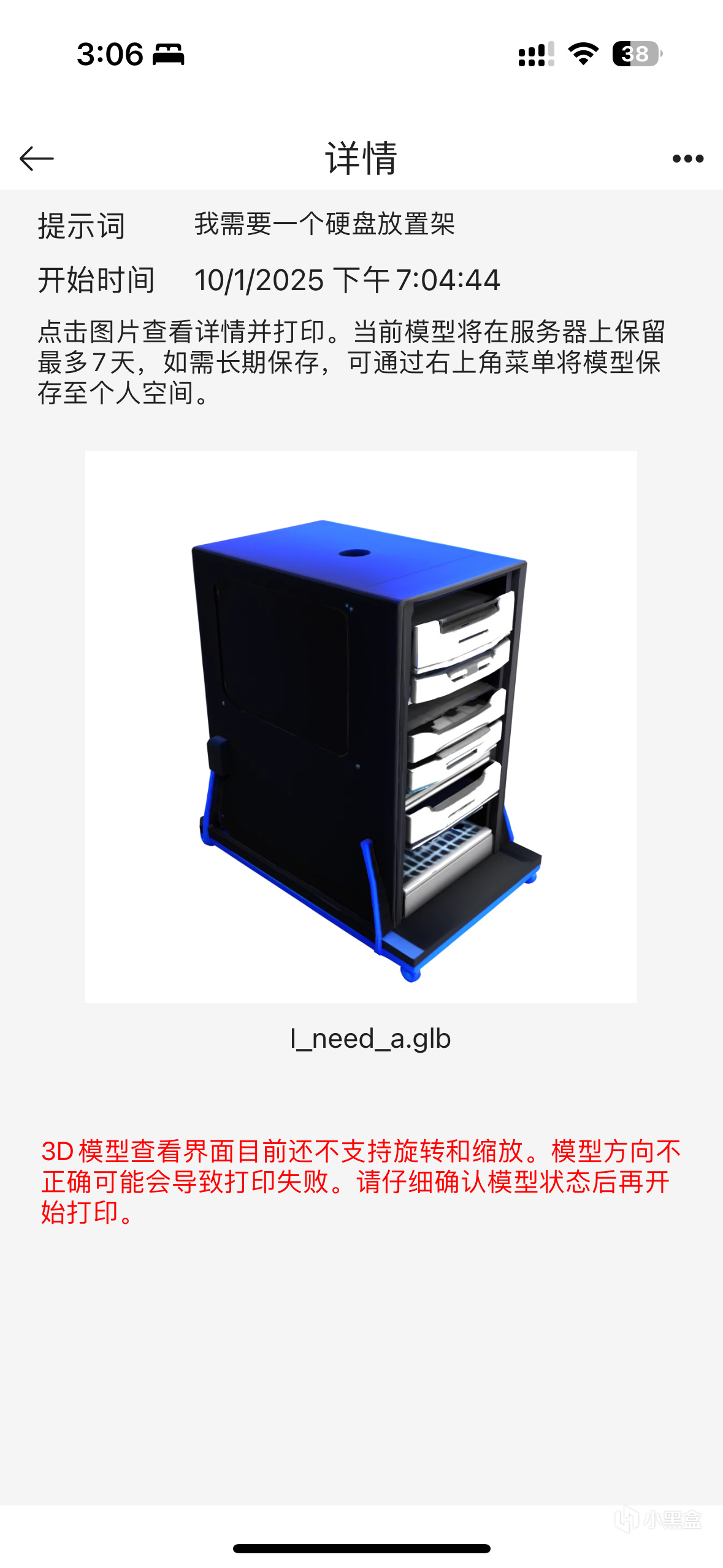 如果說你自己有創意怎麼辦?拜託!現在已經步入AI社會了,在創意中有一個AIGC 3D建模,你可以通過圖片生成模型,也可以去通過提示,生成模型,這個提示越詳細,你的模型也會越精細,就像我在組裝NAS的時候,多餘的硬盤要怎麼放置?那麼我就需要一個硬盤的放置架,於是我跟它講完,就立刻生成出來了,你完全不需要自己去建模。