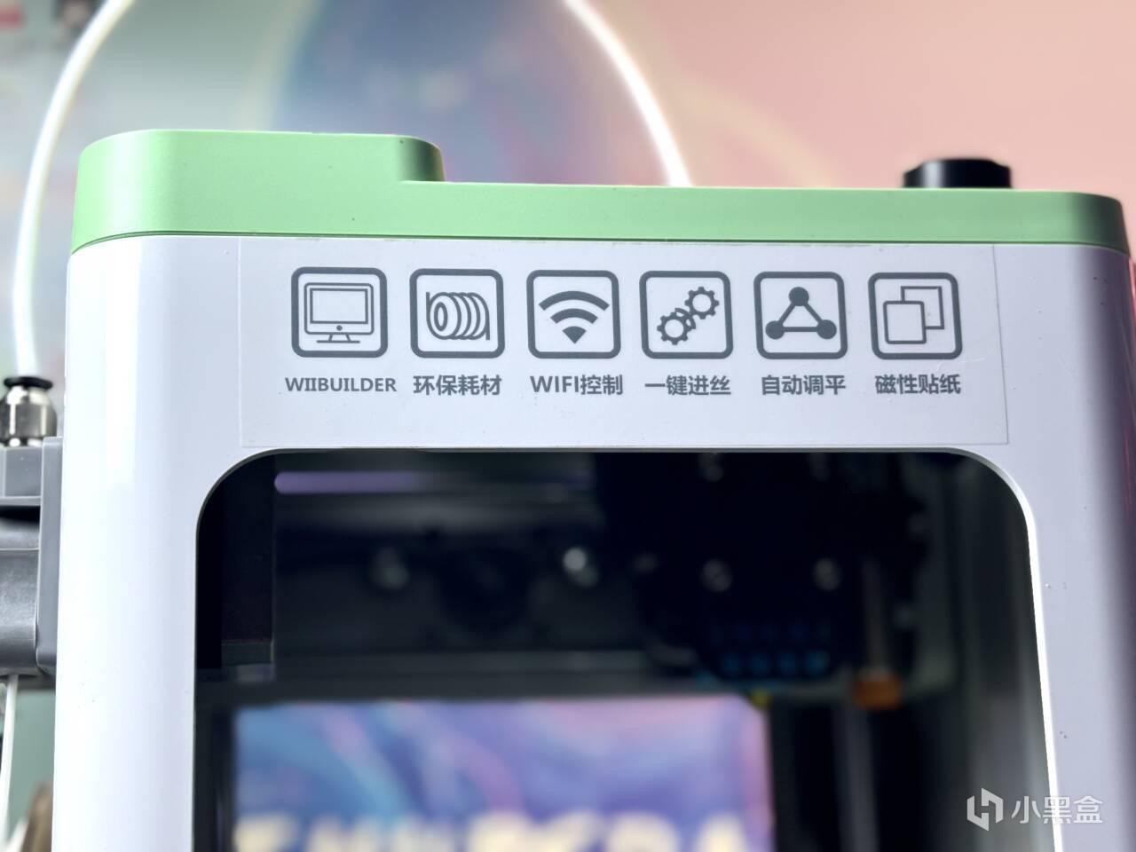 接下來就是外觀了,其實從正中間就可以看到,裏面的內部結構,像是噴頭,又或者是打印平臺等,同時在頂部還有一些產品的功能提示,例如一鍵進絲,自動調平,wifi控制,環保耗材。
