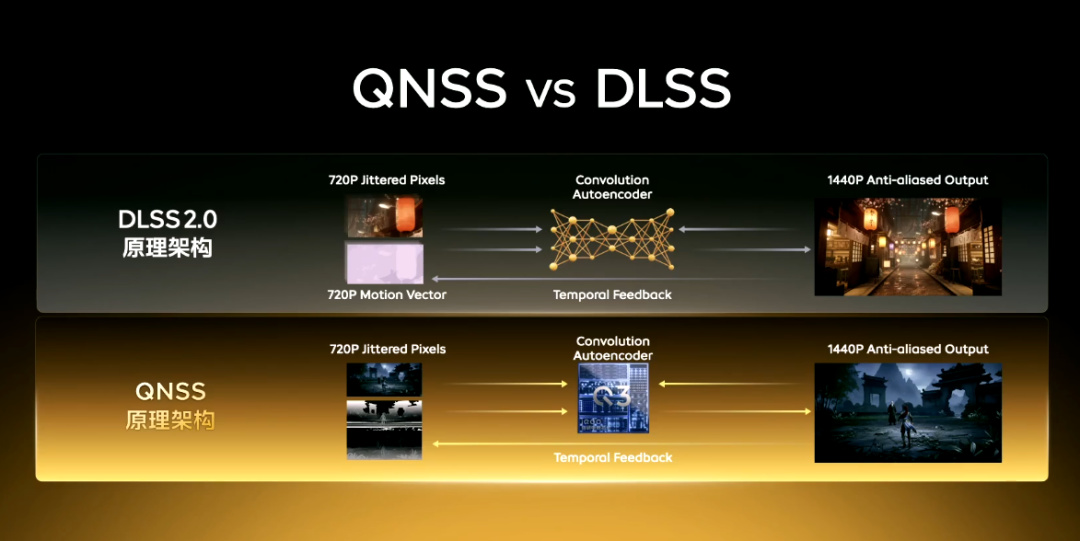 這麼說無疑太繞了,換個更簡單的例子來類比,就是這套技術和英偉達DLSS 2.0的原理高度一致,效果也很顯著,例如從演示的結果來看,QNSS能將720P的輸入畫面實時超分爲接近原生2K的圖像。