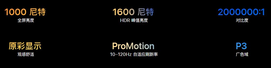 依旧配备双层OELD面板屏幕, 支持10Hz 至 120Hz ProMotion可变刷新率,1600nit HDR亮度。