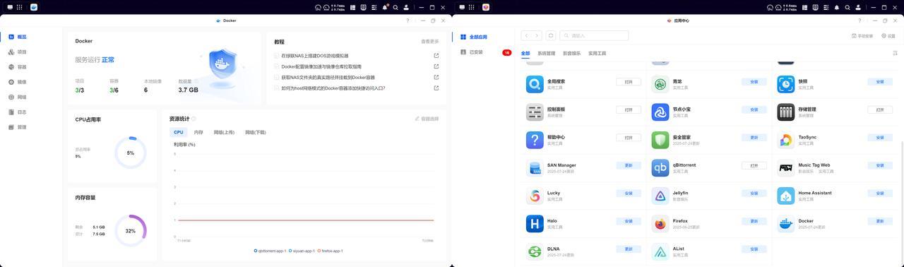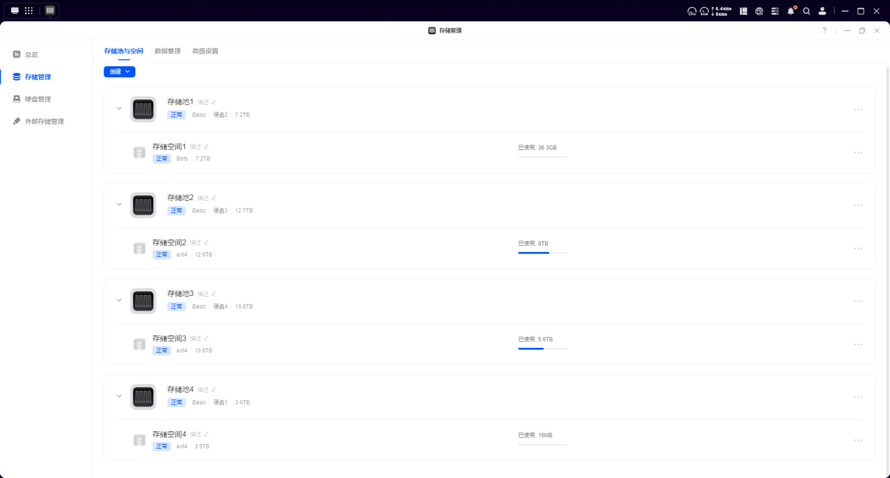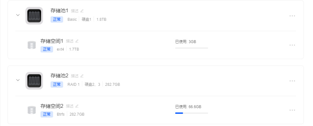 這下挺爽,在DXP4800 Plus中,兩塊小硬盤組RAID1,保存和備份各類數據,存儲池1則是用來搗鼓Docker項目和虛擬機的,只是最近忙於實驗,一直沒咋研究。