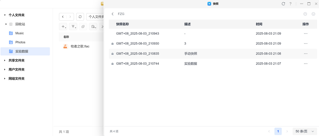快照,採用增量快照和寫時拷貝技術,能夠以儘量少地佔用存儲空間的方式記錄數據在某個特定時間點(如拍攝快照時)的完整狀態。這玩意好用,尤其是我整的工作組文件夾,大夥上傳/刪除的各類文件都會被備份,隨時可恢復(師兄老愛插手咱們各自的文獻PDF,往裏面偷偷塞新的文章... ...)。