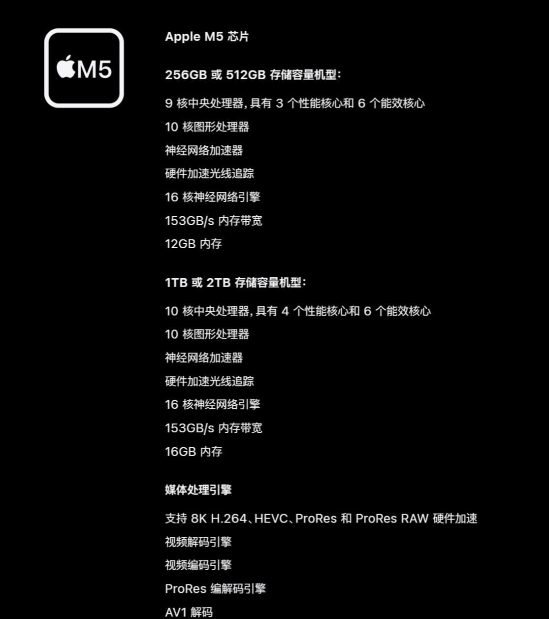 ipad pro依然是11和13英寸兩個版本,雙層OLED屏幕,SDR最高1000nit,HDR最高1600nit。M5搭載3個性能核心和6個能效核心,10核GPU,16核神經網絡引擎,12GB內存。