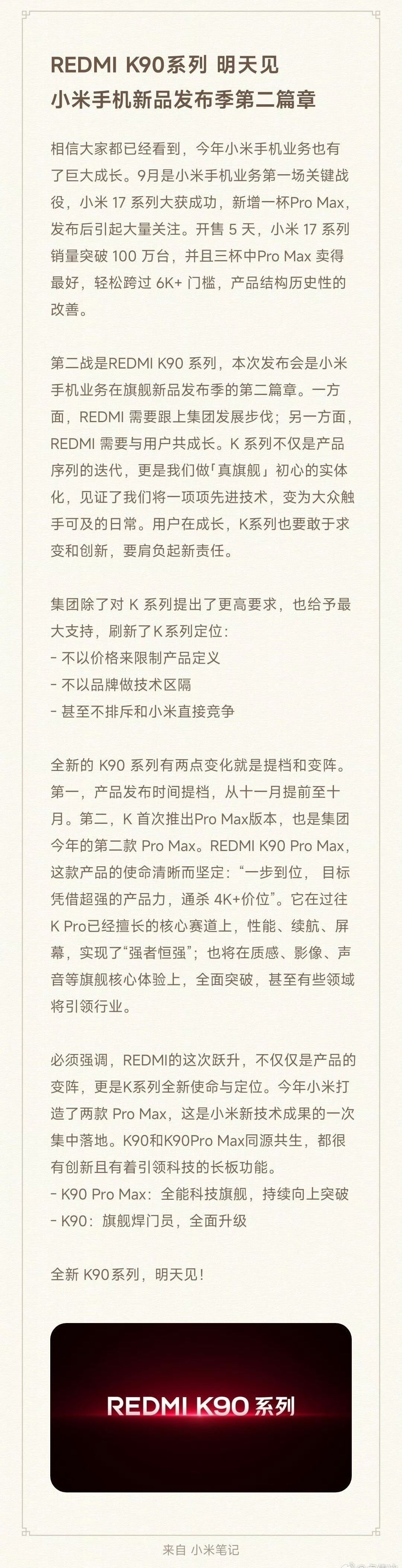 今天小米总裁卢伟冰又在自己的微博上发了一篇宣传红米K90系列的笔记。