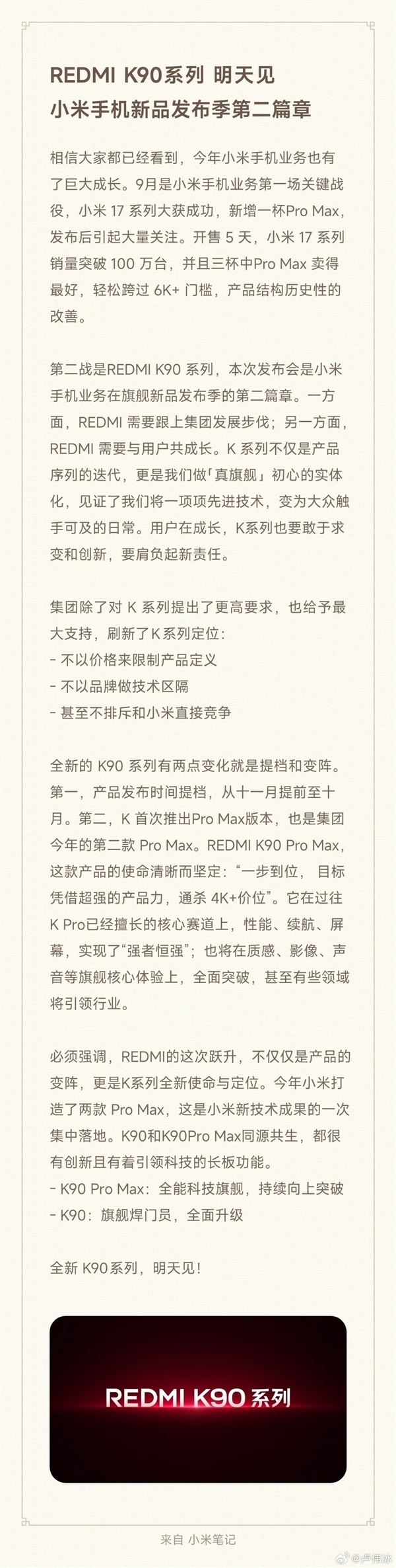 快科技10月16日消息,卢伟冰今天正式官宣,REDMI K90系列下周见。