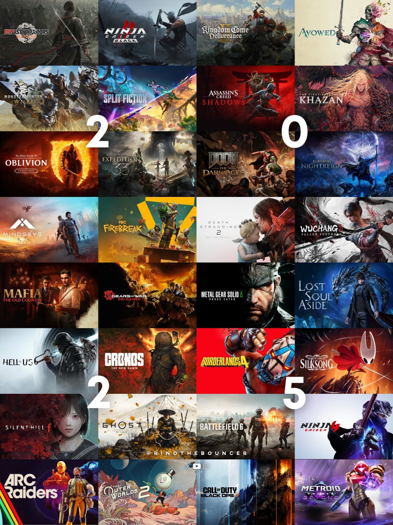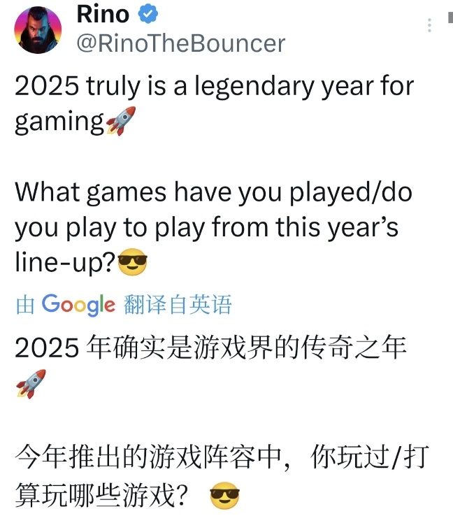 推特博主 @RinoTheBouncer 最近發帖稱“2025真的是遊戲傳奇的一年”,並配出一張將今年重磅新作拼接在一起的海報。海報集中展示了從動作、角色扮演到開放世界、射擊等多個類型的重量級作品,引發玩家社區熱議:有人感嘆“積壓史無前例”,有人則認爲“用‘傳奇’形容還爲時過早”。