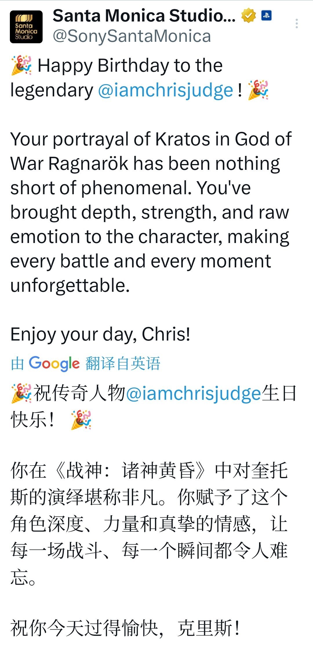 圣莫妮卡在官方社交账号上写道:“祝传奇人物生日快乐,Christopher Judge!你在《战神:诸神黄昏》中对奎托斯的演绎堪称非凡……祝你今天过得愉快,克里斯!”并配文向其致意。该帖在发布后被大批粉丝转载、评论与转发。