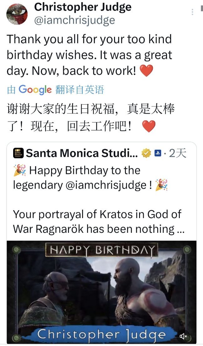 圣莫妮卡工作室在社交平台为《战神》系列中奎托斯配音/表演者Christopher Judge送上生日祝福,并称赞其在《战神:诸神黄昏》中的表现“堪称非凡”。Judge转发并回复“现在,是时候回去继续工作了!”,这句简短回应迅速在粉丝圈引发热议,部分玩家把它视为系列新作或衍生作动向的积极信号。