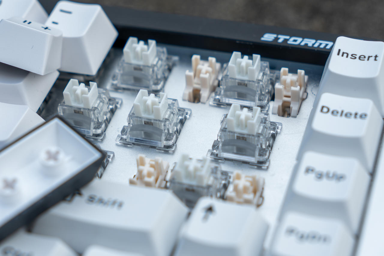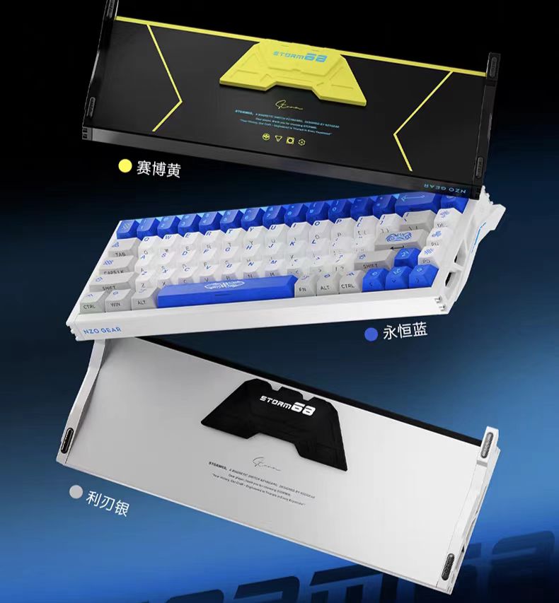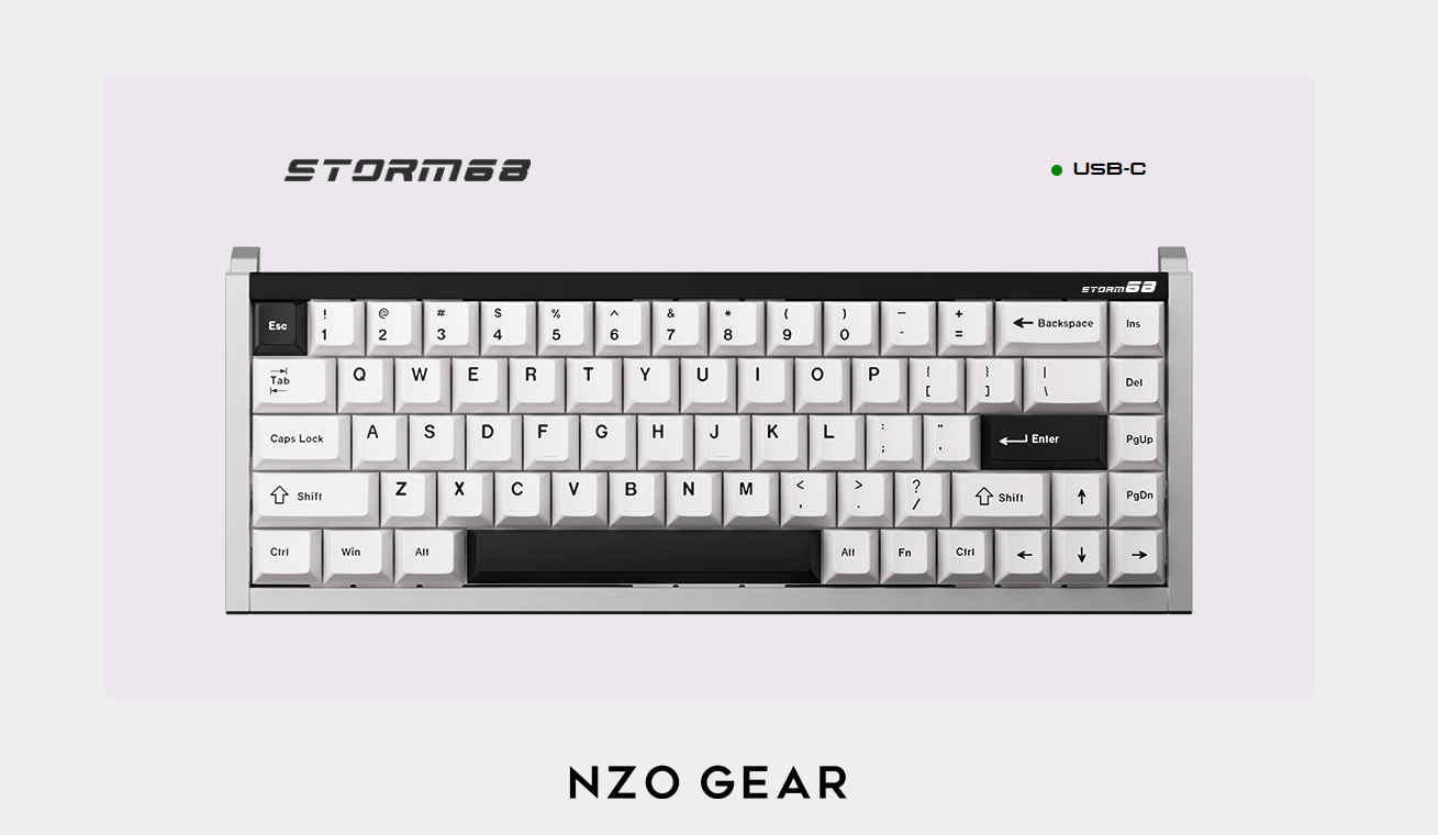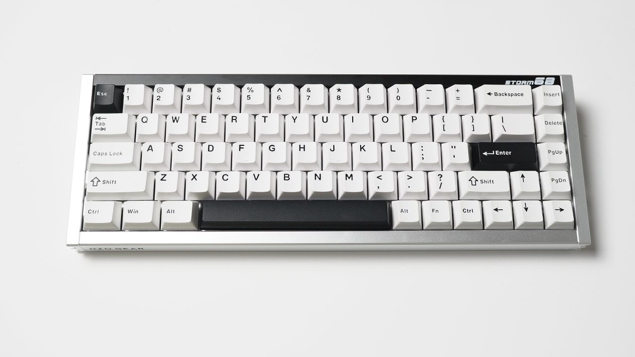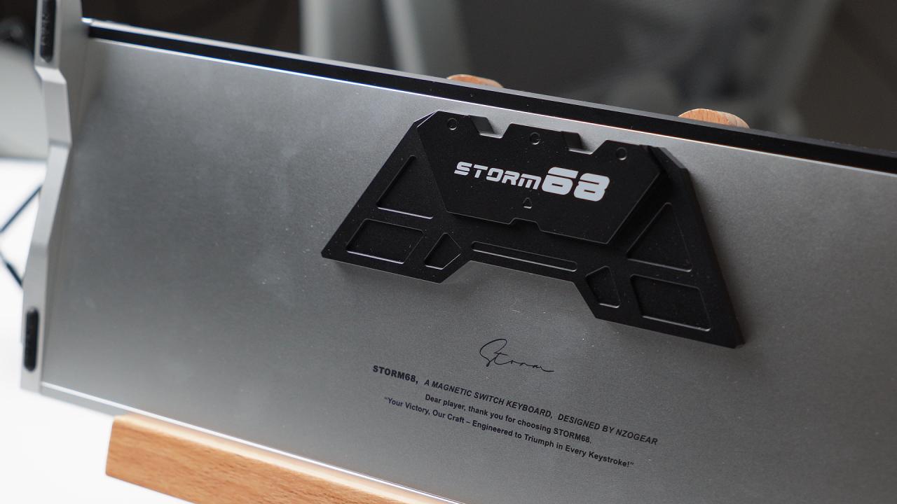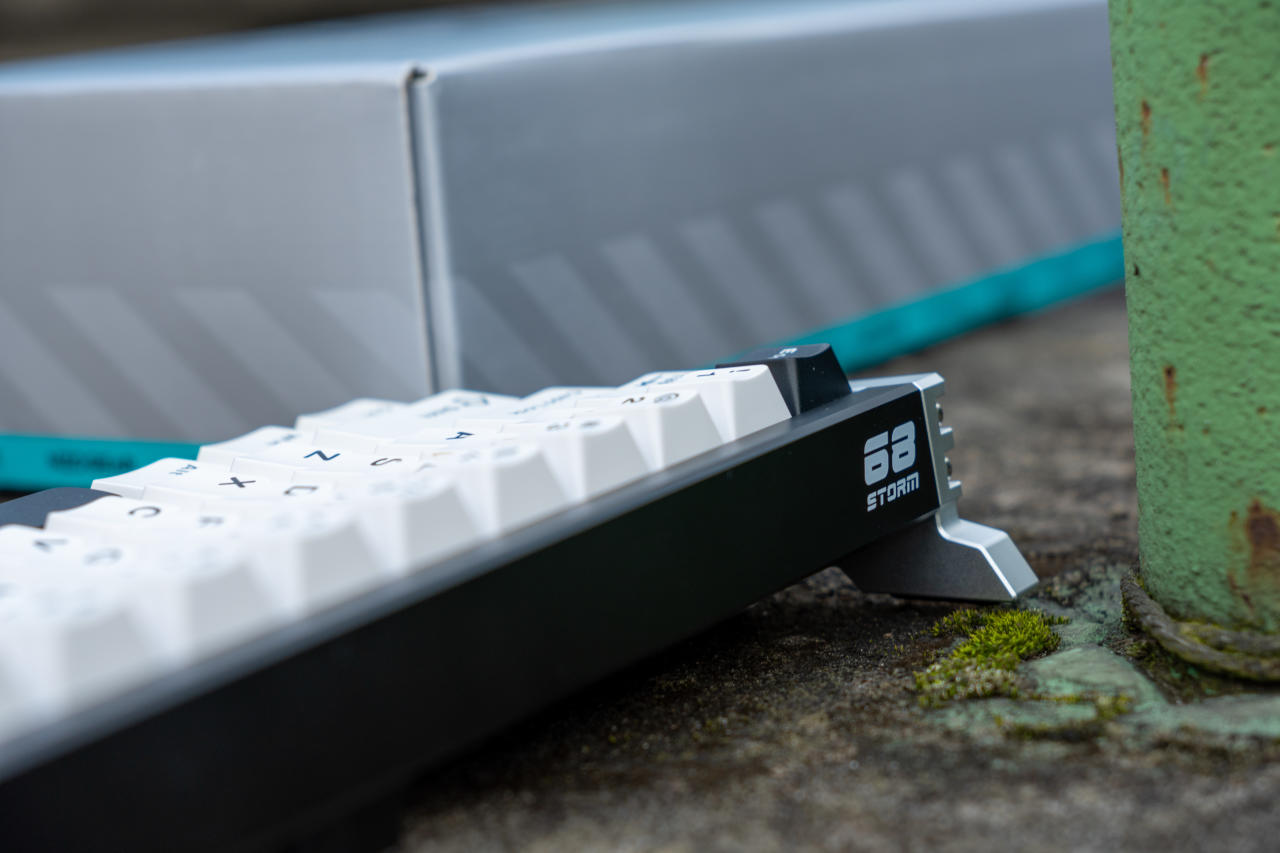 鍵盤整體配色爲黑白撞色,後方的黑色長條鋁板印有白色產品名:Storm 68