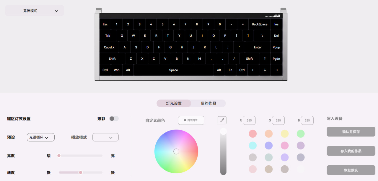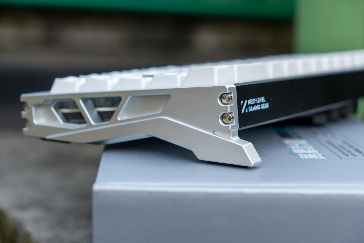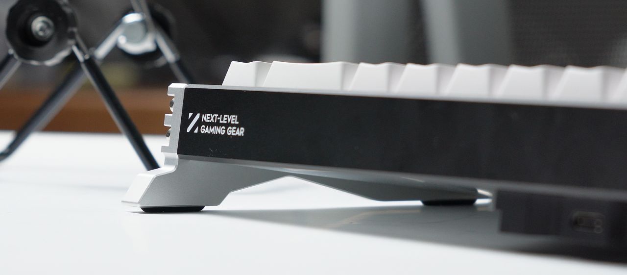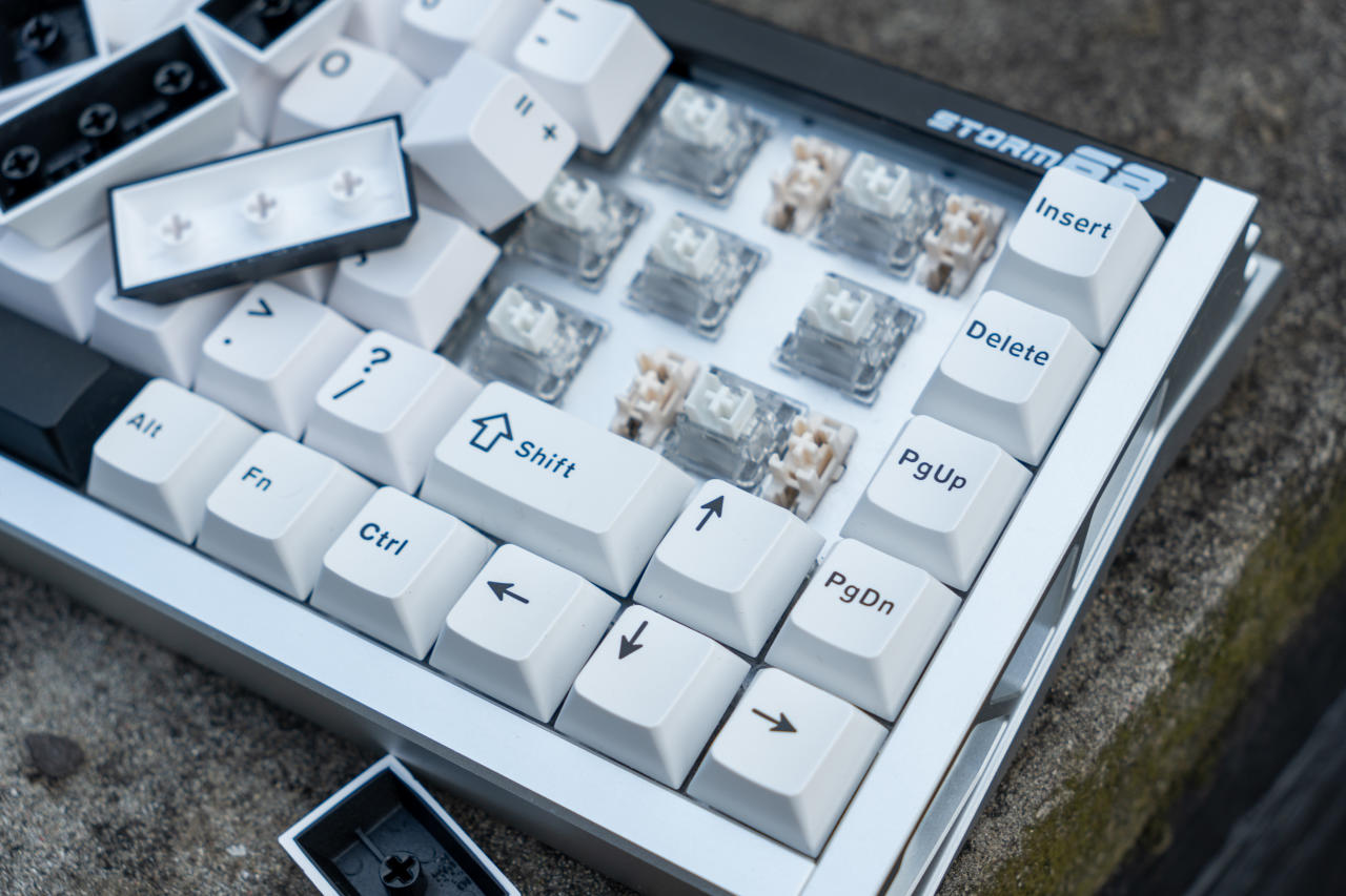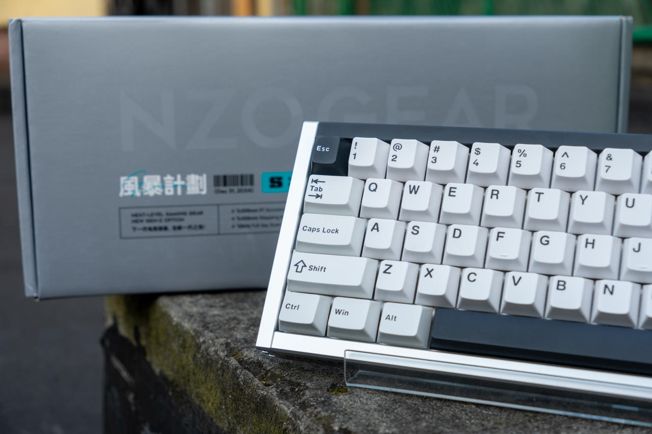 鍵盤整體配色爲黑白撞色,後方的黑色長條鋁板印有白色產品名:Storm 68