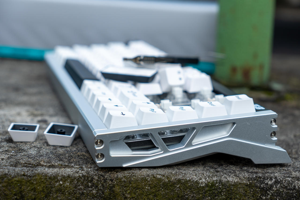 拔下雙色注塑的PBT鍵帽,可以看到鋁合金定位板