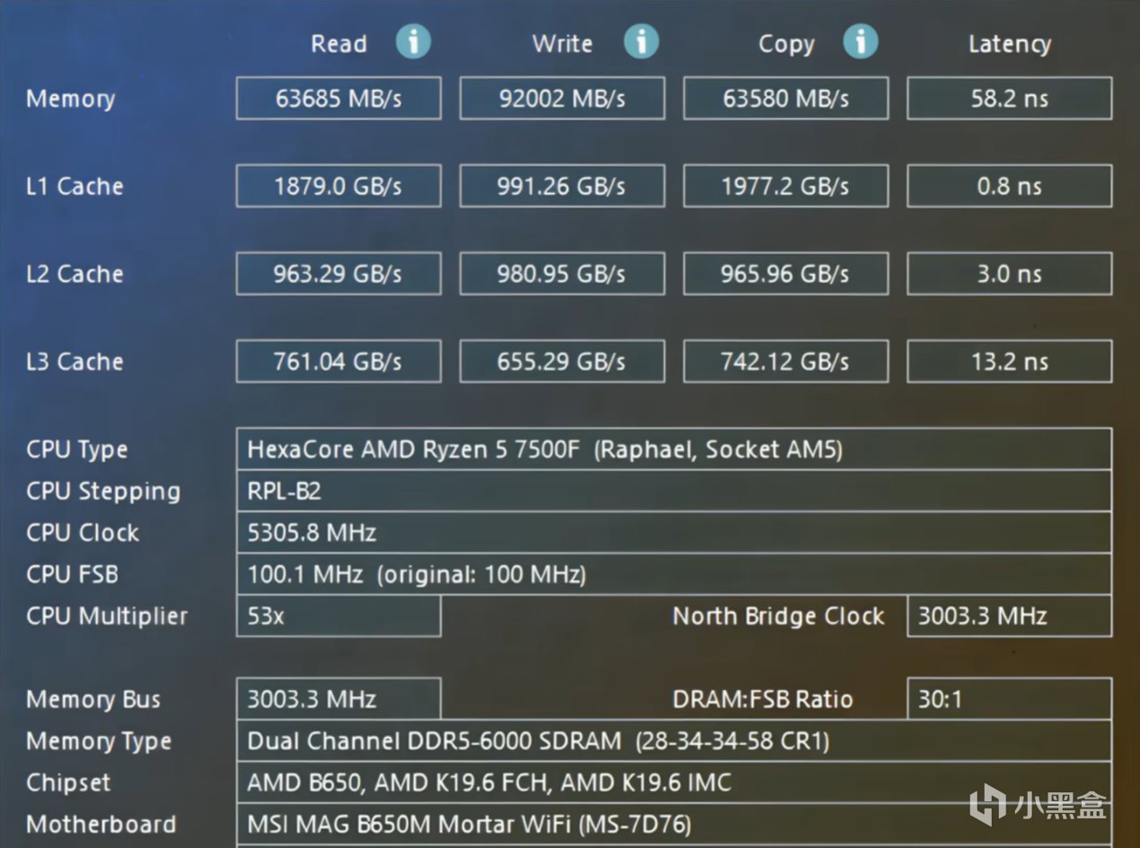 可以看到在调完之后,变化最大的就是写入速度来到了92002MB/s,同时延迟降低到了58ns,并且时序也有一定优化,在28-34-34-58,跑了十多轮TM5也并未见任何报错,还是挺不错的。