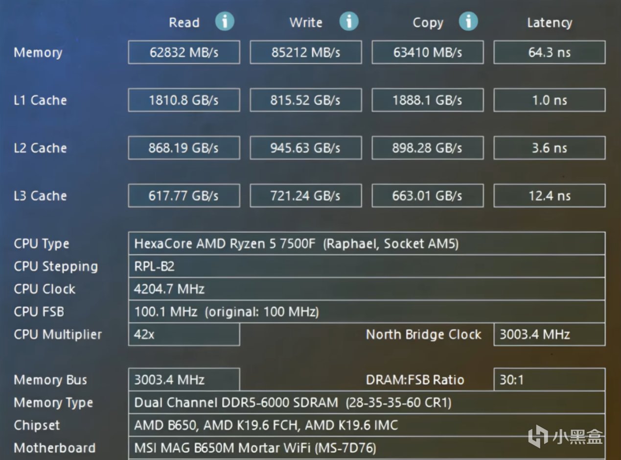 可以看到在开启Expo的情况下,内存条的频率为6000MHz,时序28-35-35-60,读取速度62832MB/s,写入速度85212MB/s,复制速度63410MB/s,延迟在64ns。