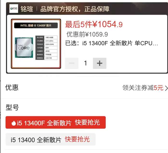 英特尔小部分型号大幅上涨,例如装机之前装机大热型号——i5 13400F
