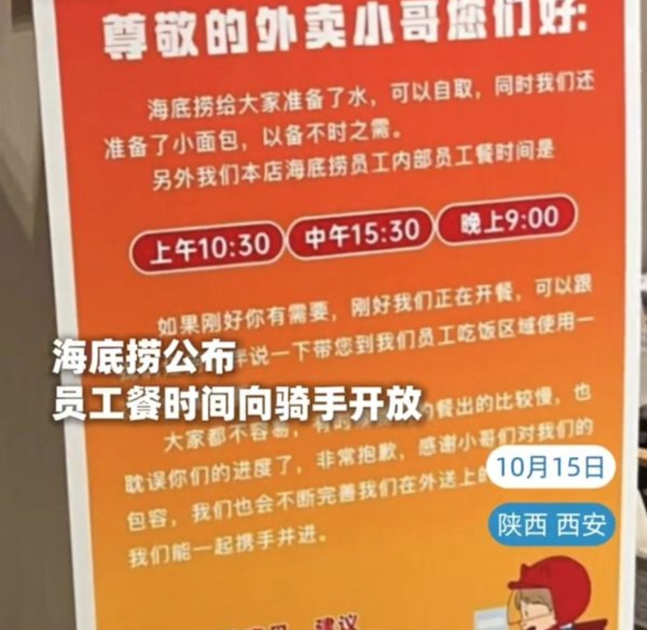近日,陕西西安一家海底捞门店因设立“外卖骑手能量驿站”而受到网友好评。该驿站为外卖骑手提供免费饮用水和面包,并允许他们在员工餐时间进入员工区域,使用一次性餐具就餐。