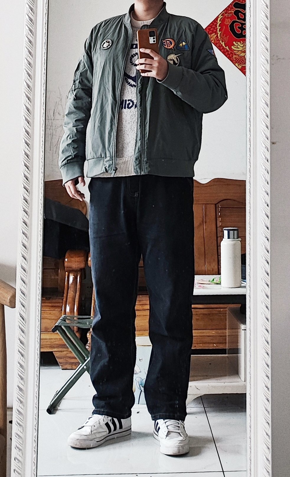 我当时最喜欢这件飞行员夹克了,现在也喜欢,可惜有点中二了质量出奇的好,穿了有四五年了,里面续的一层薄薄的羽绒,穿到零度没有问题。和正经飞行员夹克比起来体型比较正常,上面的刺绣和徽章我特别喜欢,应该是独角兽吧,我没看过这一代。
