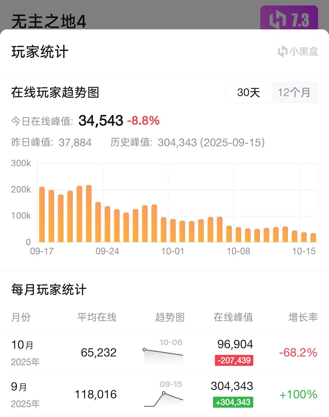 曾创下两周销量破250万份、狂赚1.5亿美元佳绩的《无主之地4》,在发售一个月后遭遇严重玩家流失。根据SteamDB数据,该游戏Steam同时在线玩家数从首发时的304,398人暴跌至目前的36,522人,流失率高达85%。