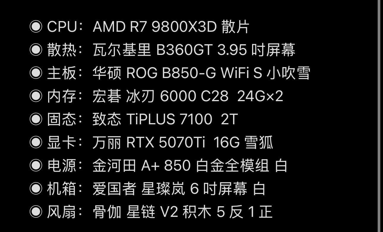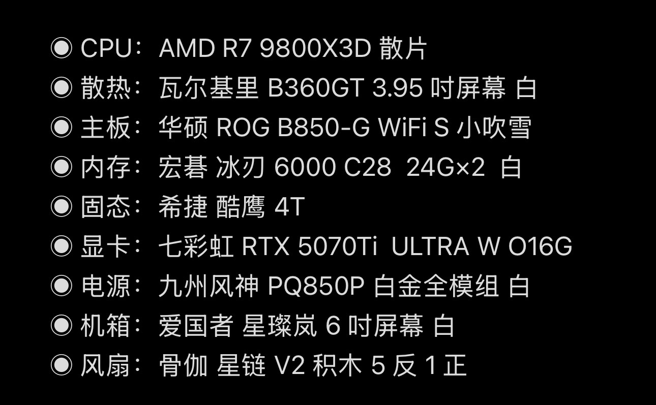 白色海景房系列:9800X3D + 5070Ti + 星璨岚,颜值性能都很能打。