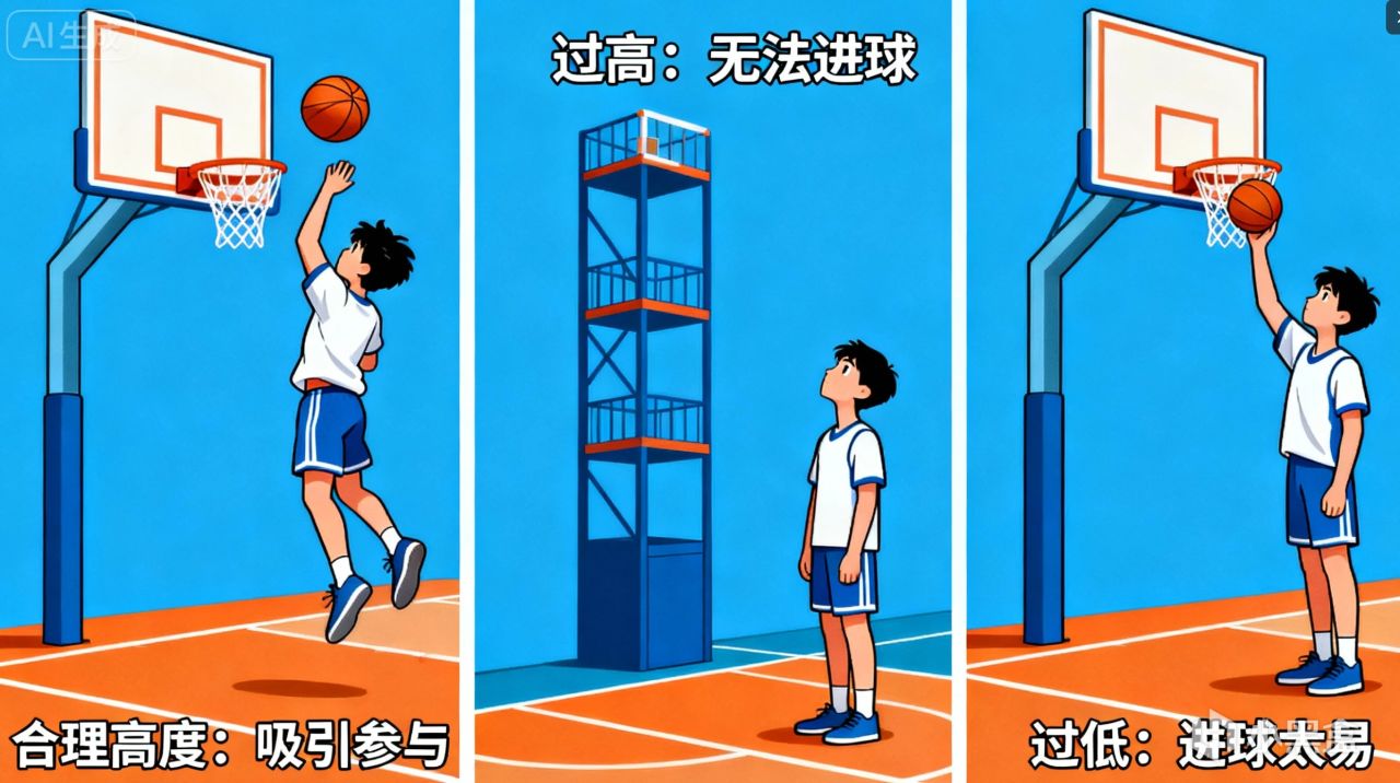 洛克以籃球架爲例,籃球運動能吸引那麼多人蔘與,其中一個原因就是籃球架的高度設置合理。要是把籃球架設計得像兩層樓那樣高,就根本不可能進球了;反過來,要是籃球架只有一個普通人那麼高,進球就太容易了。