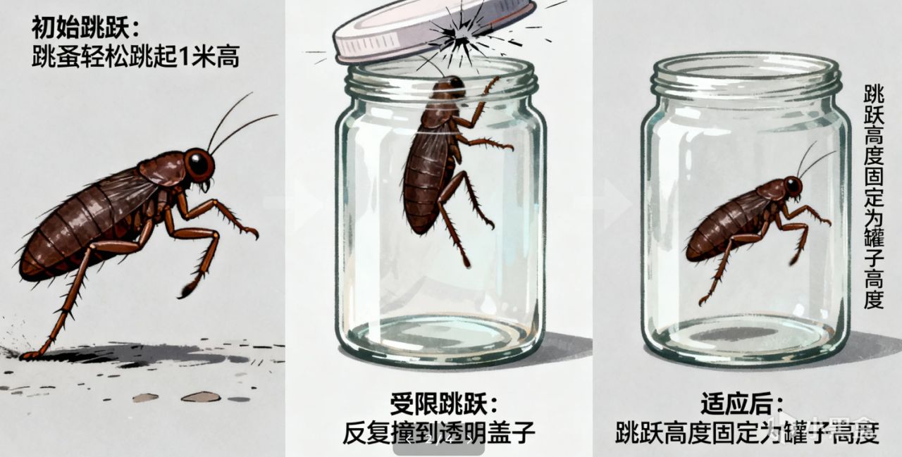過一段時間後,生物學家拿掉蓋子,發現跳蚤依然能跳躍,但已經無法跳到一米以上的高度了——原來它已經適應了瓶子的高度,並且調節了自己的跳躍能力,不再改變了。