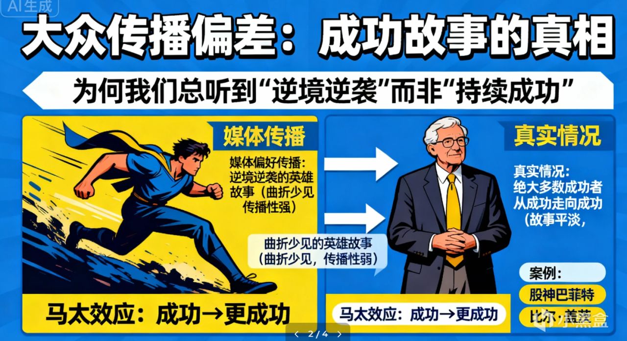 但事實上,這是一種大衆傳播的偏差。我們時常聽說那些在逆境中成功的英雄,是因爲這些英雄的故事本身曲折且少見,更具備廣泛傳播的可能性。事實上,絕大多數的成功者都是“從成功走向成功”,只不過他們的故事太過於平淡無趣,在“馬太效應”的影響下,他們的成功邏輯大多是“因爲他們很成功,所以他們變得更加成功了”,像股神巴菲特,比爾·蓋茨都屬於這種人