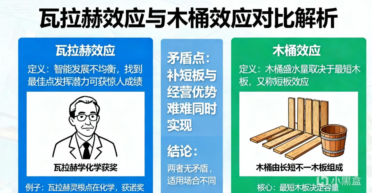 乍一看,“瓦拉赫效應”似乎與“木桶原理”背道而馳,而且兩者不可調和,因爲同時補齊短板和經營優勢,在現實中不可能實現,或者說實現成本過於巨大。其實,兩者並無矛盾,只是適用的場合不同