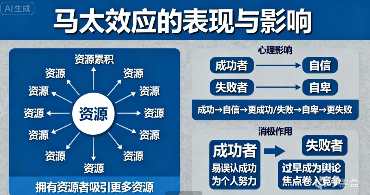 “馬太效應”一個最大的表現形式是資源的累積。擁有資源的人可以吸引更多資源,因爲資源本身會尋找別的資源去整合。與此同時,馬太效應也會對個人的心理產生巨大的影響。成功者因爲成功而自信,然後因爲自信而更成功;而失敗者因爲失敗而自卑,然後因爲自卑而更失敗。