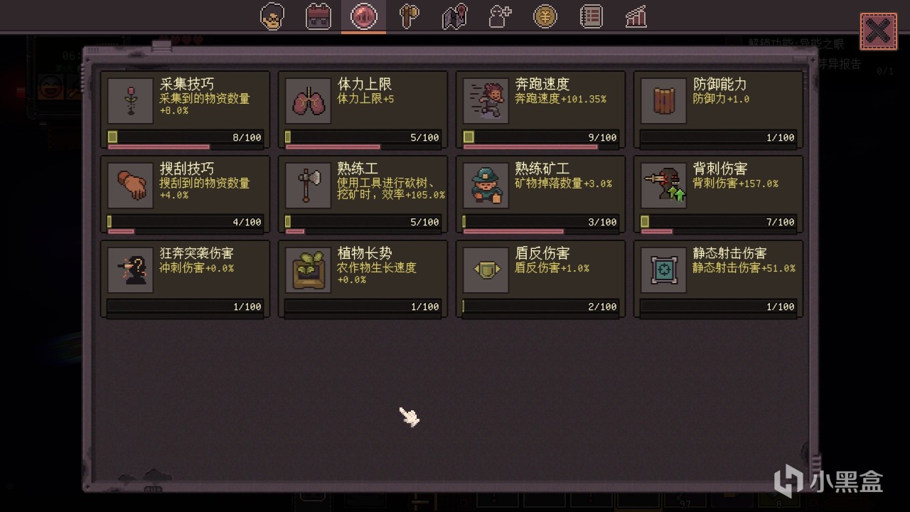 游戏里我们的主角是有着各种各样的生存技能的,而且这些个技能都会在无意中升级,比如多跑动能提升“奔跑速度”,多采集能提升“采集技巧”,除此之外还有体力上线、防御能力、搜刮技巧、熟练工、盾反伤害等等12种能力的等级,各自上限是100级,有没有一种“肝”隐隐在疼的感觉?