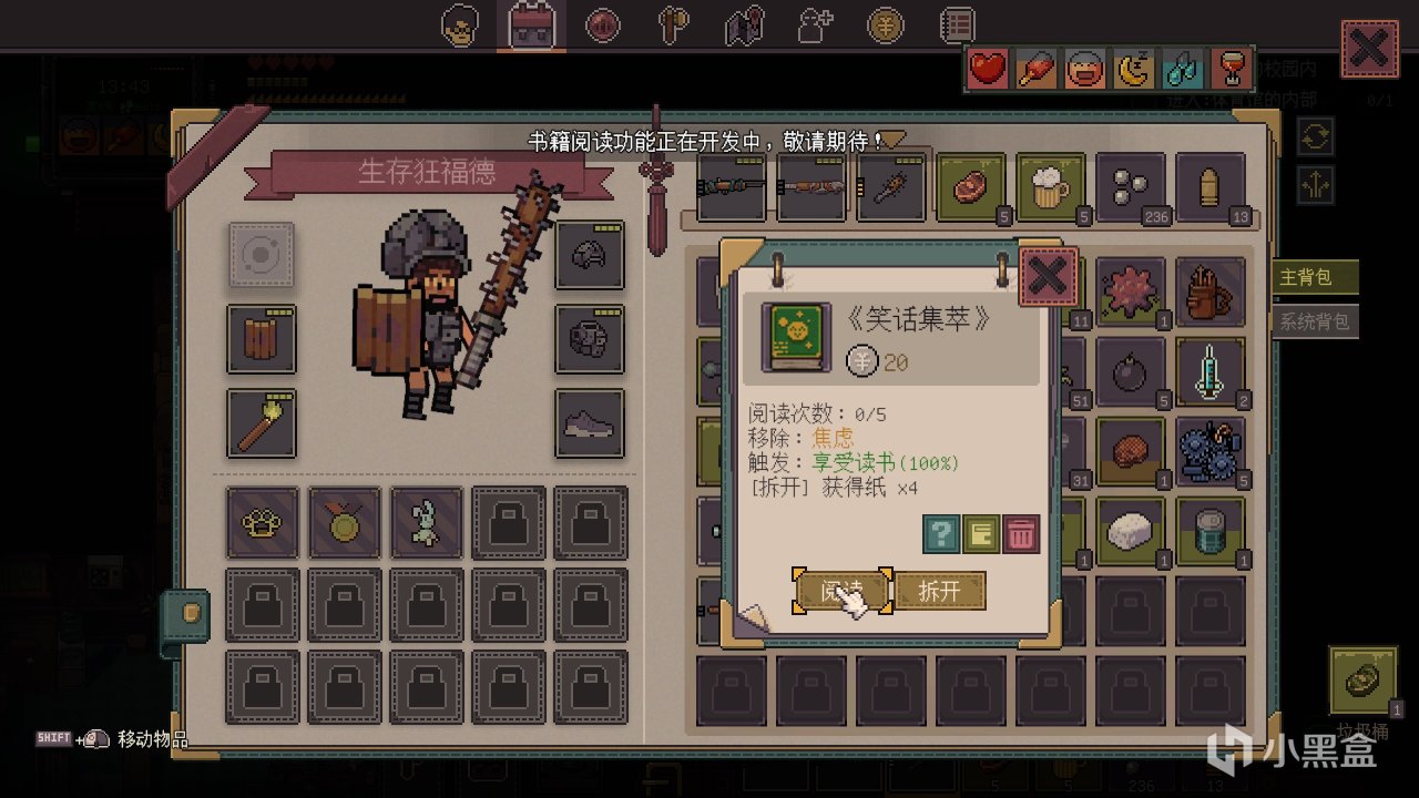 对了,游戏最让人舒服的应该是“自动拾取”功能,在我们拾取范围内,只要背包有空位,无论什么东西都会自动拾取放入我们背包里叠加起来,相当方便。这在模拟生存游戏里其实就很重要,被丧尸各种追杀着呢,哪有空慢慢的挑选拾取?也算是颇有创意了。