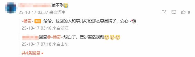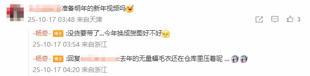 在評論區,不少玩家表示“猜不到是誰”,有人推測這與工作室爲明年製作的新年短片或宣傳片有關。對此,楊奇在回覆中帶着玩笑意味回應:“哈哈,這回的人和事兒可沒那麼容易猜了,安心~”並在被問及是否會用於新年視頻時表示“沒貨要帶了...今年換成賀圖好不好”,同時提到“去年的無量蝠毛衣還在倉庫裏壓着”,令粉絲對用途又多了幾分好奇。