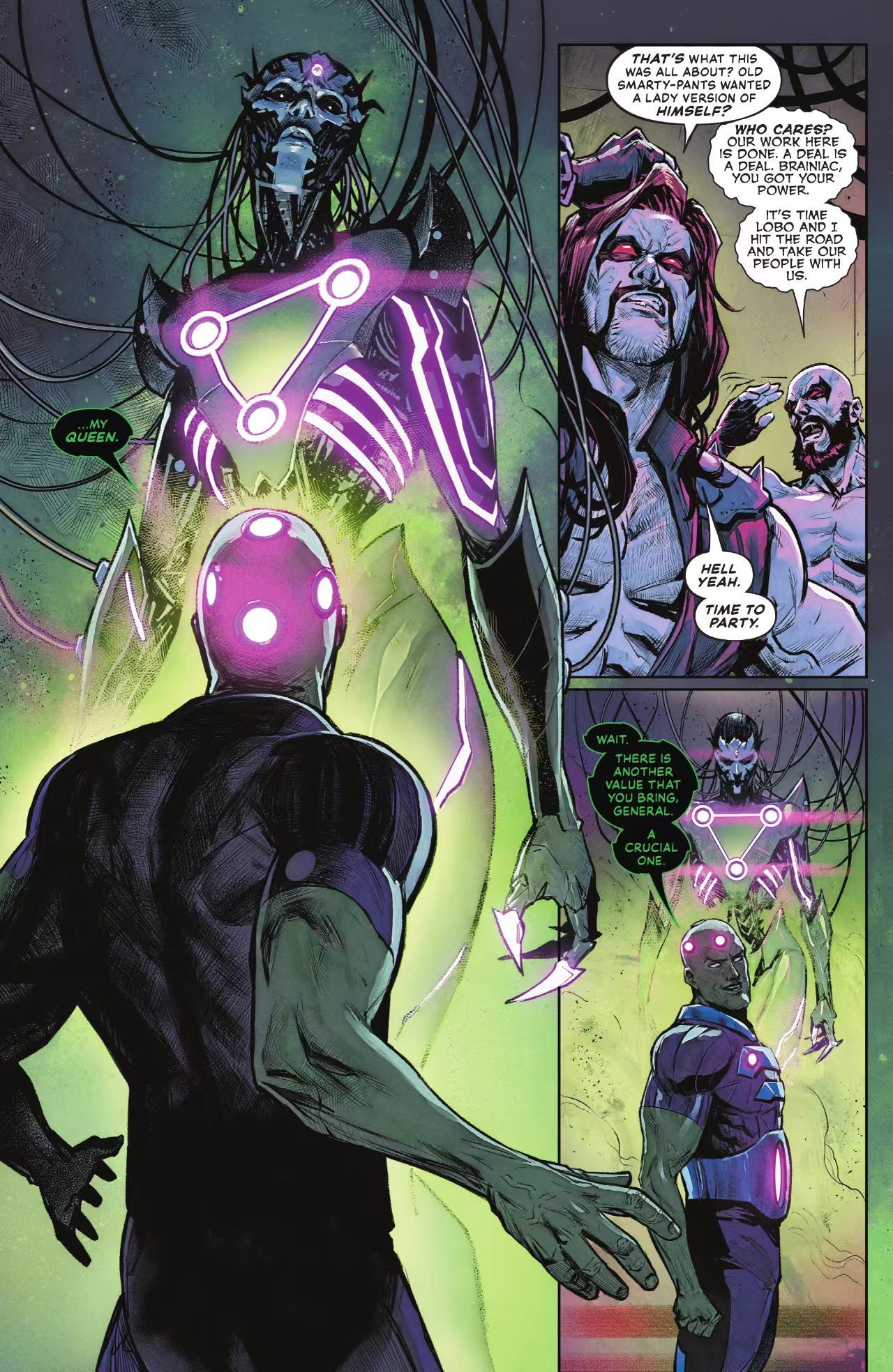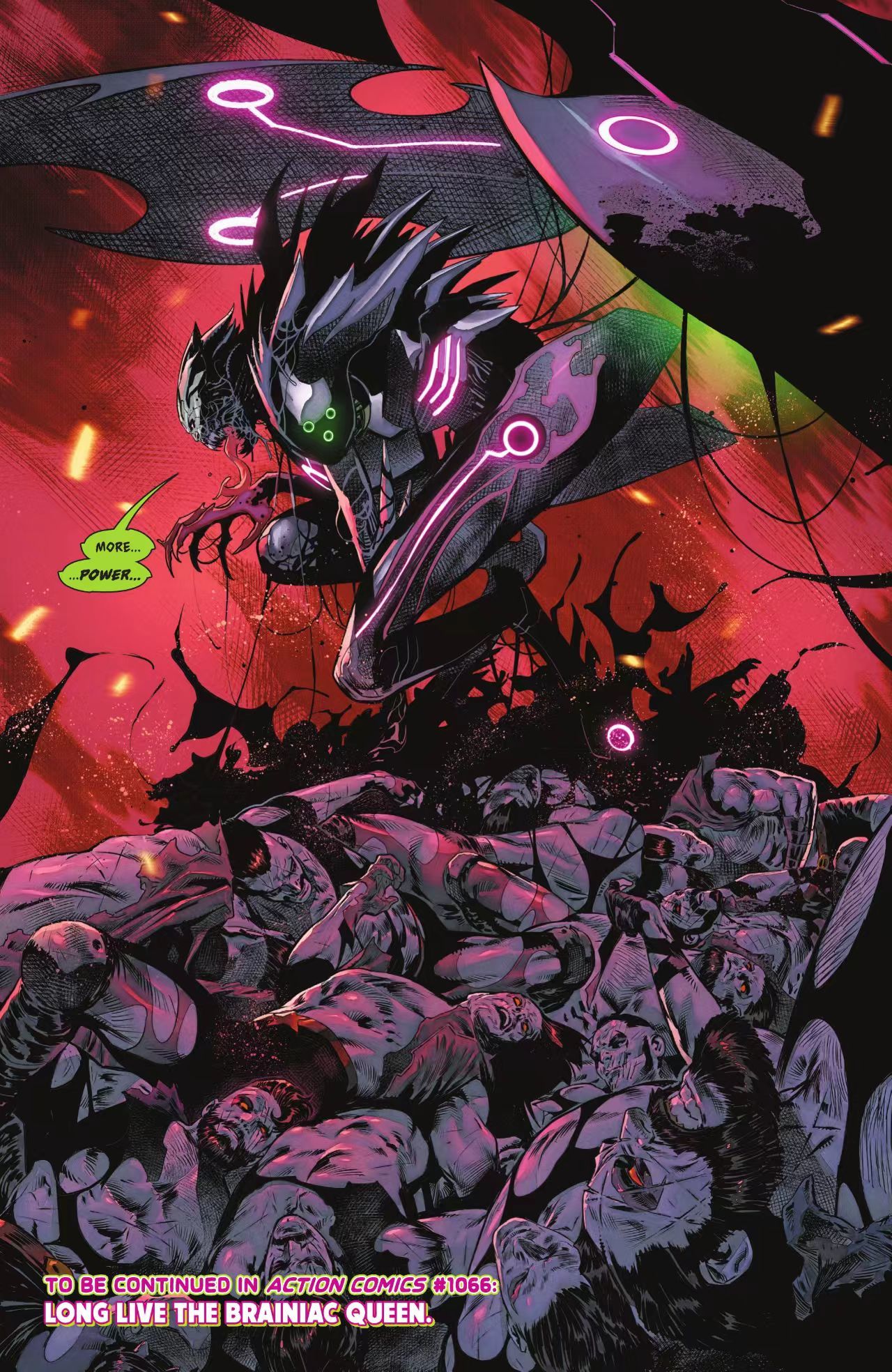 最终目的肯定是没达成的,在给超家人和卢瑟(卢秃这里暂时被洗白成好人了)破坏计划后,女王变回人形态,被布莱尼亚克格式化后放在飞船里发向了地球(脑子真的是有点洞的),不出所料给我们的宇宙搅屎棍沃勒截了,并把女王的意识放在虚拟空间训练了20年,用来培养对超英们的仇恨。
