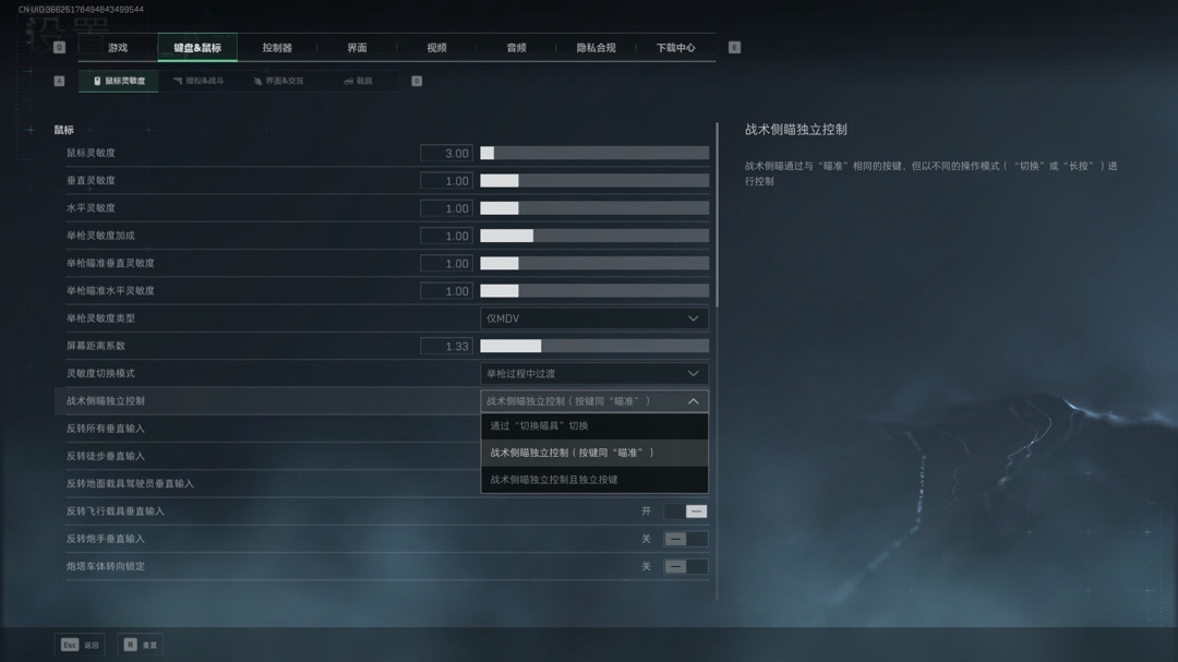 我们只需要在设置里面的键盘&鼠标里面,下拉找到战术侧瞄独立控制,选择第二个。这样我们点按右键就是开镜,长按就是开启侧边镜!