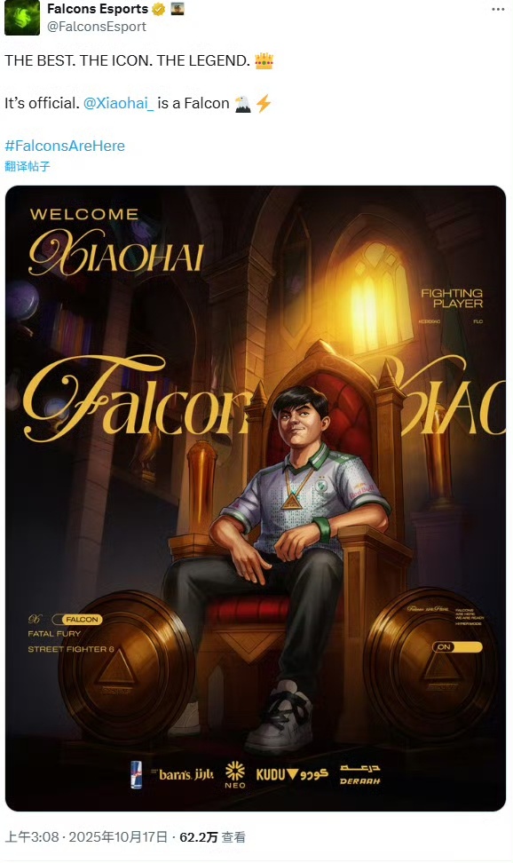 10月17日,沙特知名电竞战队Falcons官方宣布,中国格斗游戏选手“小孩”曾卓君正式加入俱乐部。