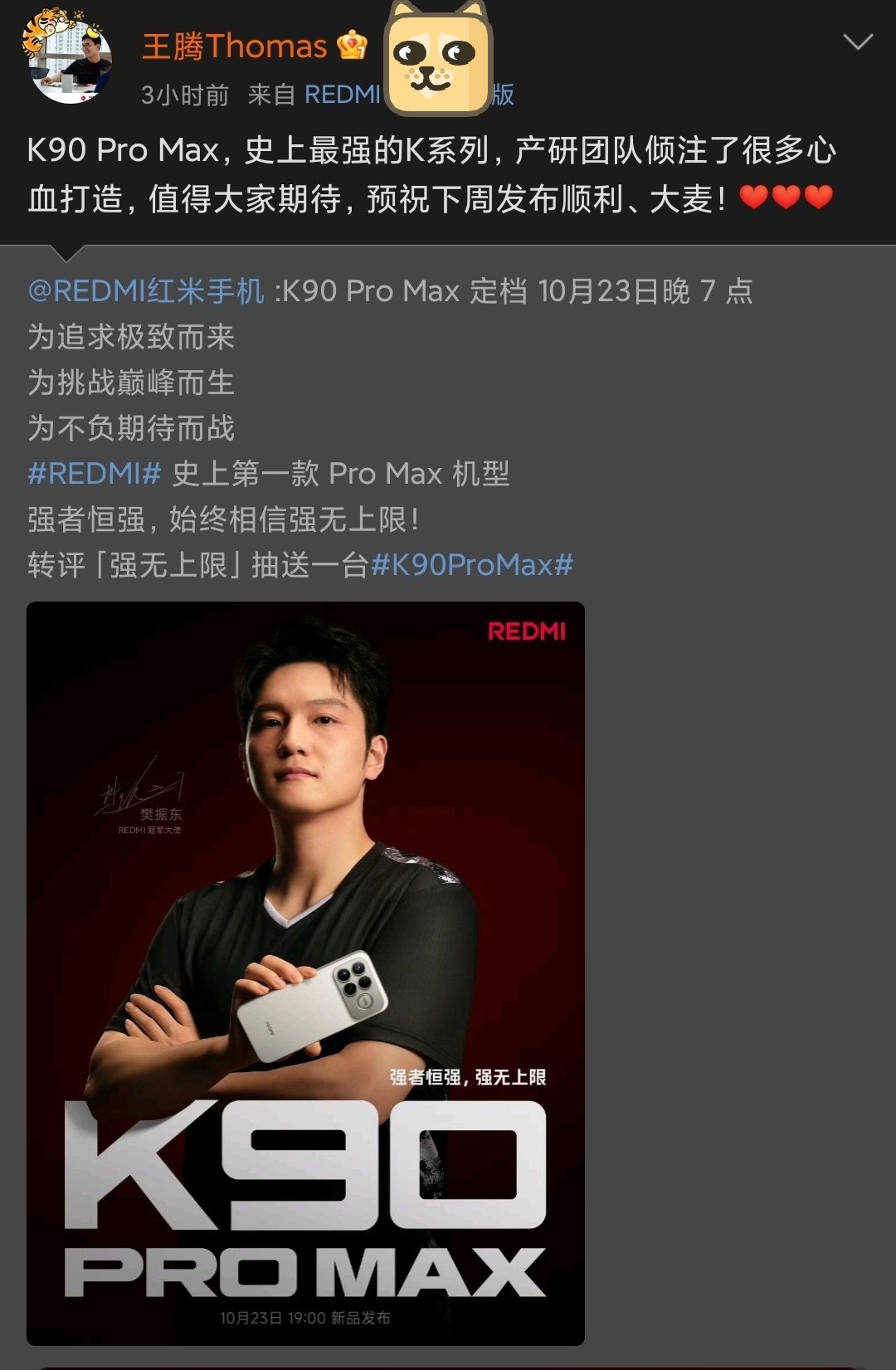 今天就在紅米K90系列官宣之後,王騰也是在第一時間轉發了紅米K系列相關海報與官圖。