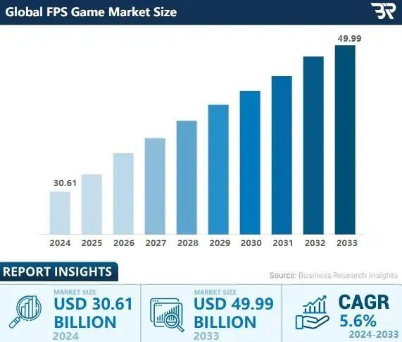 而Newzoo、BusinessResearch的报告数据显示,2024年全球射击游戏市场规模约为726.8亿美元,预计到2032 年将达到1929亿美元,年复合增长率高达13%。