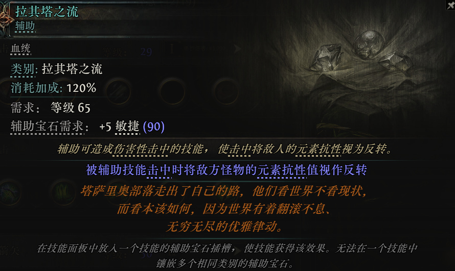 說一說輔助寶石的搭配:輔助技能分別是快速攻擊II、元素軍械II、頑抗II、從容不迫和拉其塔之流,不愧是最貴的輔助寶石,反轉元素抗性確實很給力。沒有的小夥伴可以換成閃電協調,這裏需要注意快速攻擊這個輔助技能在三級時會有一個致命的負提升,我們只需要開到二級就行。