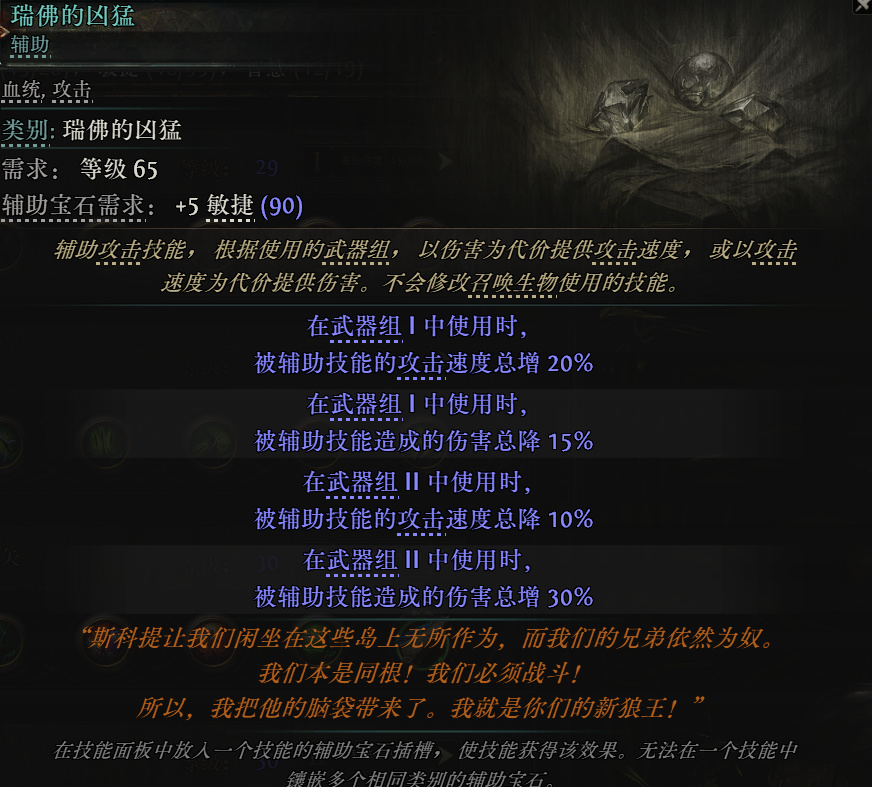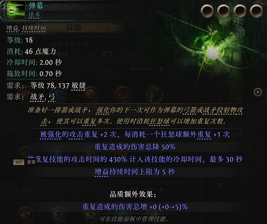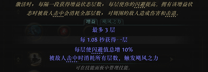 這個技能不用投資太多,四格頂天了。輔助寶石推薦致盲II、癱瘓、擊退和範圍擴大。這樣我們在觸發風舞者之後可以緩一大口氣,足以脫困和補狀態了。