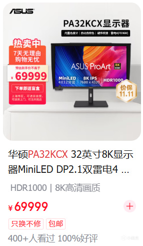 华硕推出了其旗舰级 8K 显示器 ProArt PA32KCX,它同时支持 HDR 和 Mini-LED 技术,是目前全球首款 8K HDR Mini-LED 显示器。
