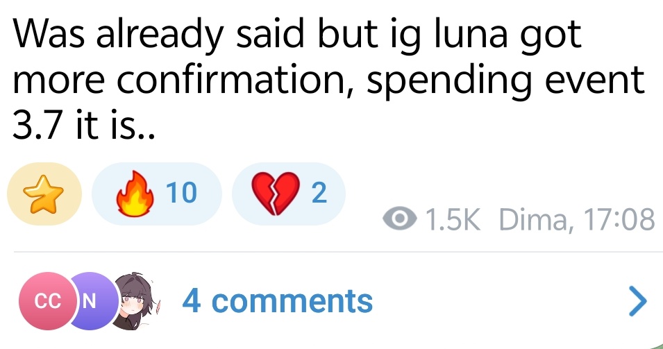 另一则紧随其后的信息进一步证实了这一猜测,指出:“虽然已经说过了,但我想 Luna 得到了更多确认,3.7 版本的消费活动已经确定。”这表明玩家等待充值的原因很可能是在即将到来的 3.7 版本中,游戏将推出一项能让玩家消费(Top Up 或使用已充值货币)并获得额外奖励的活动。