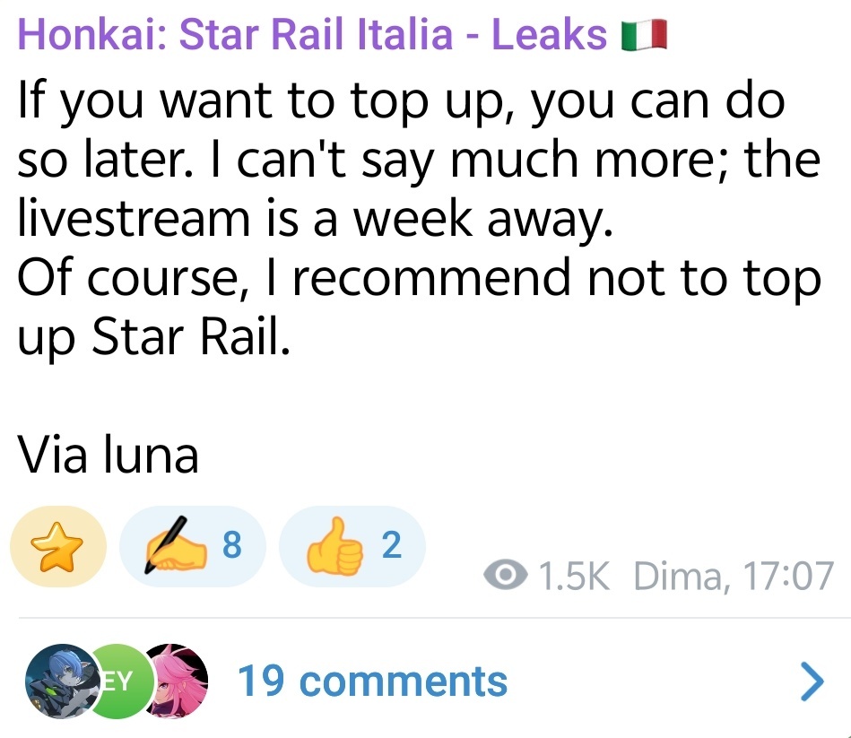 根据该信息,玩家被建议暂缓在《崩坏:星穹铁道》中进行“Top Up”(即充值)。消息称:“如果你想充值,可以晚点再做。我不能透露更多;直播活动在一周后。”随后,该消息明确建议:“当然,我建议不要为星穹铁道充值。”这一建议似乎暗示着在不久的将来会有与充值/消费相关的活动。