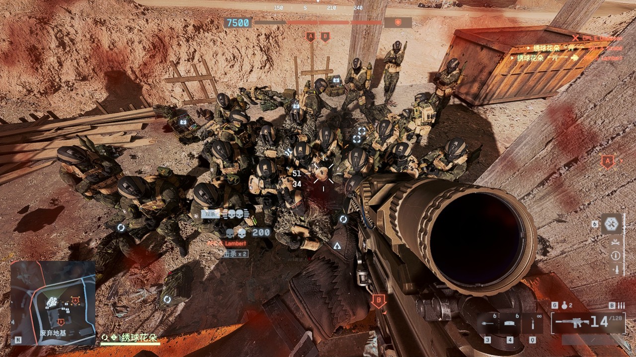 然后往人群中的地下丢一枚地雷,用我们想要刷的枪械把这个地雷打爆掉,地雷的AOE伤害会瞬间击杀大量NPC,然后这些NPC会按照使用枪械击杀的方式计算人头,理论上一瞬间可以32杀,不到30分钟可能就可以刷满全部枪械配件。