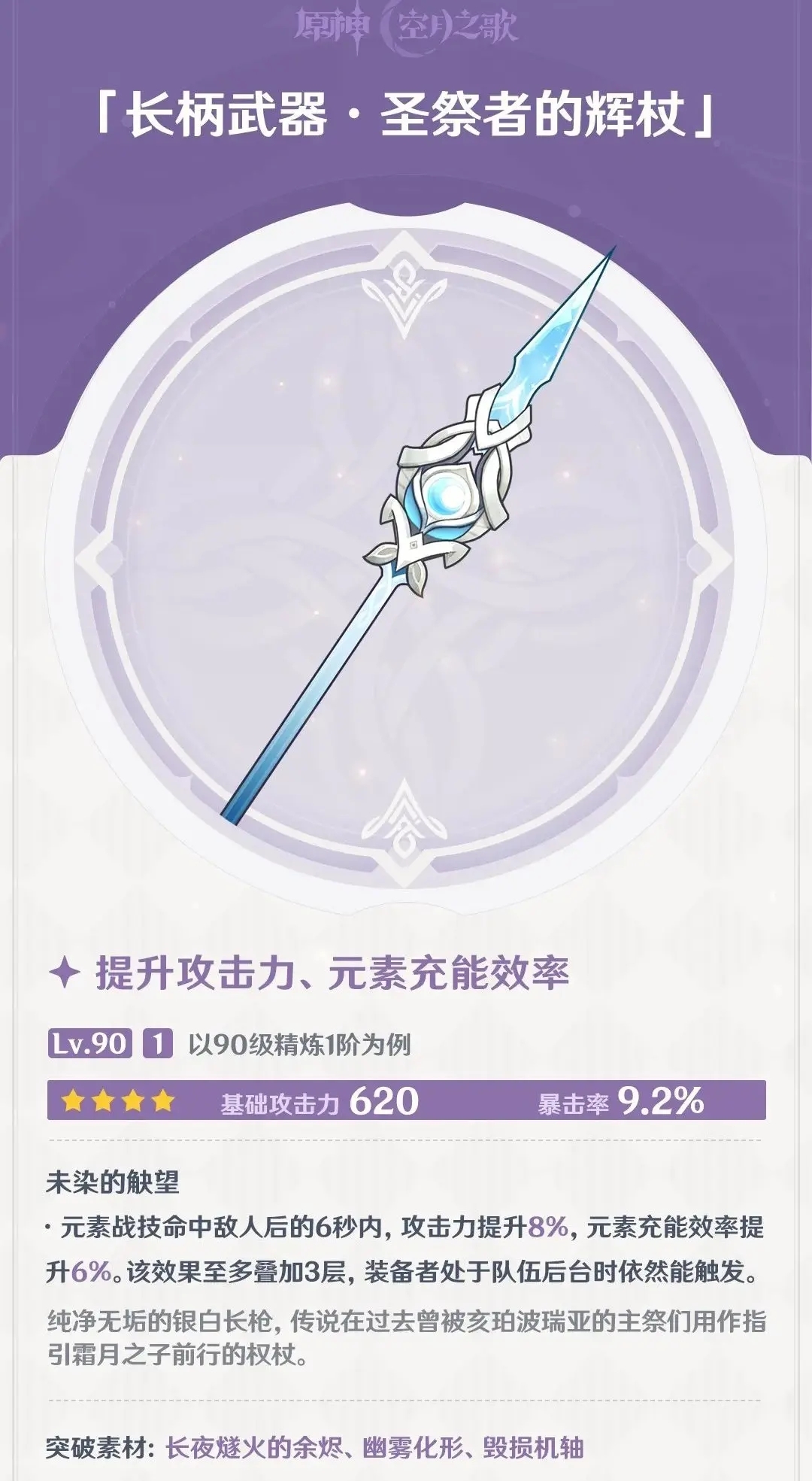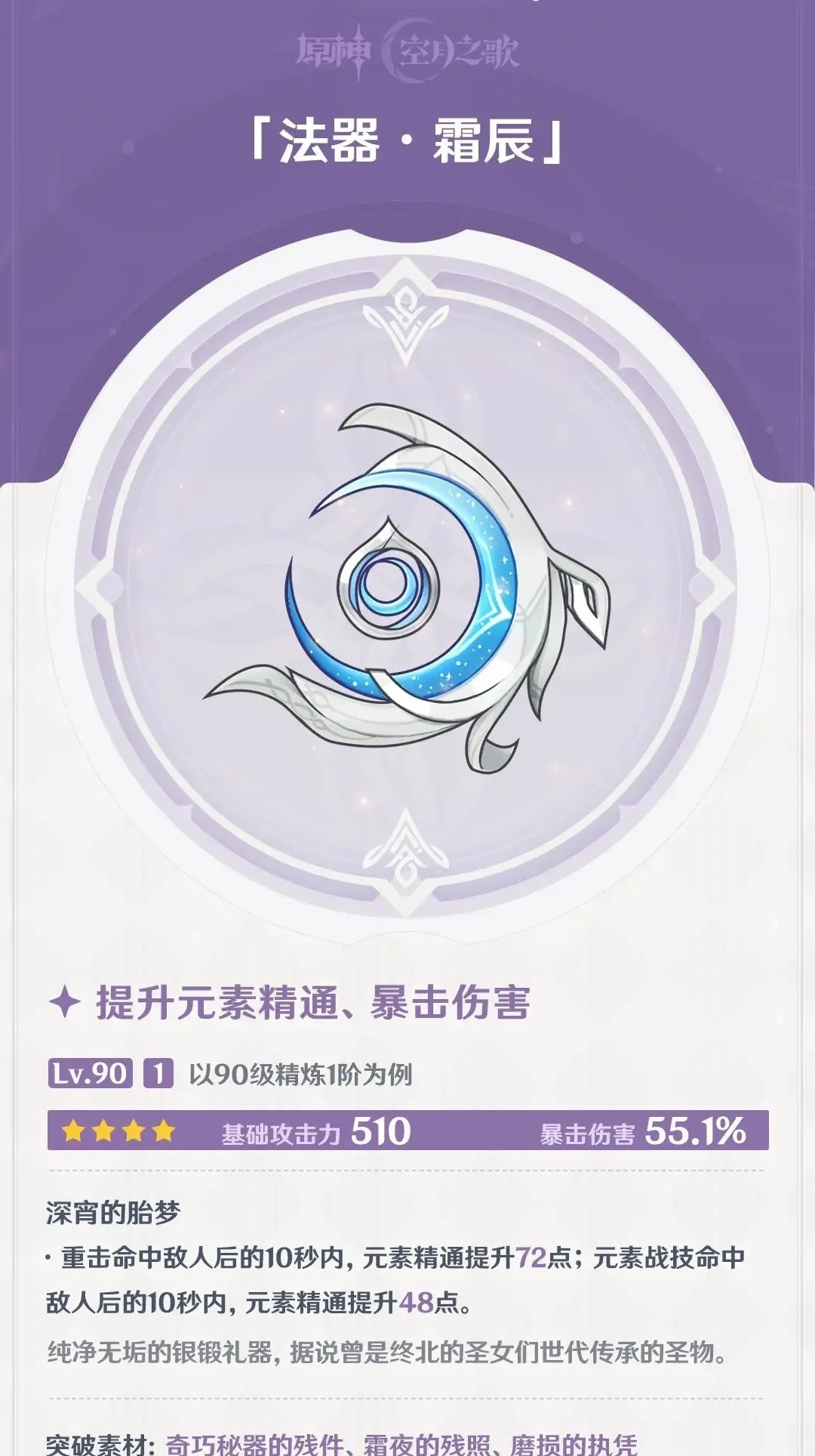 奈芙尔的四星替代武器,适合依赖重击+元素战技打反应的法器角色,既能补爆伤又能堆精通