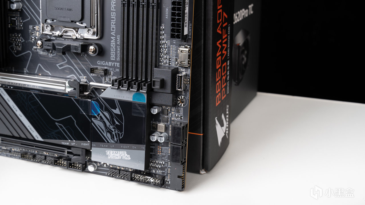 首先來看看B850M電競雕的整體外觀,定位就是高顏值黑色主板,但它並非完全純黑主題,散熱裝甲上採用亮黑、槍灰以及灰色三種顏色營造電競風格,尤其是亮黑部分還隱約地貫穿了AORUS LOGO,質感和信仰值拉滿!尺寸方面則是標準24.4X24.4CM的MATX規格。