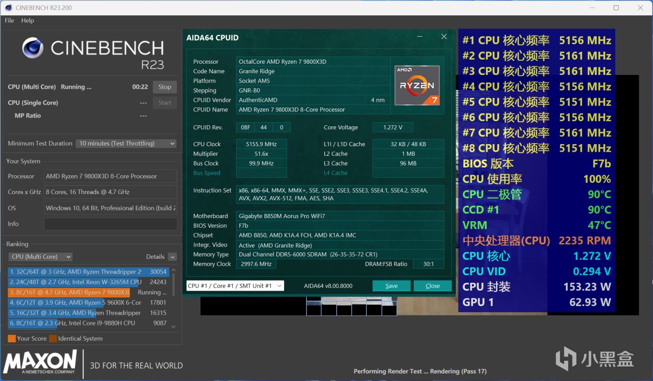 烤機方面就通過CINBENCH R23十分鐘多核項目驗證,可見銳龍7 9800X3D核心頻率能保持5.15GHz左右,CPU二極管最高溫度則是90℃,封裝功耗爲153W,B850M電競雕軟顯VRM供電溫度僅爲47℃,用料確實很足,I/O通風孔設計到位。