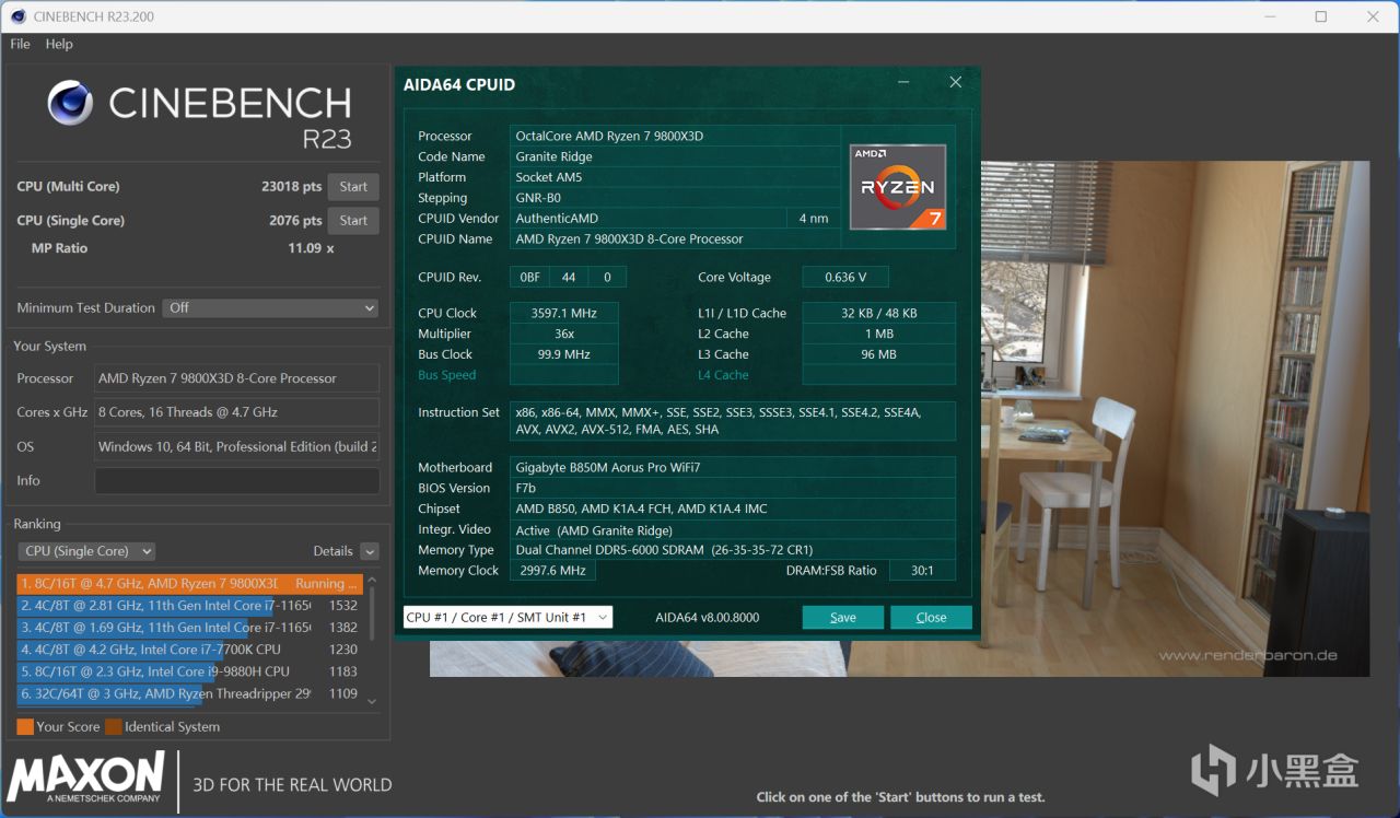 CINBENCH R23單輪成績,銳龍7 9800X3D多核爲23018 pts,單核則爲2076 pts,從跑分來看B850M電競雕和X870主板完全一致,跑滿9800X3D無壓力。