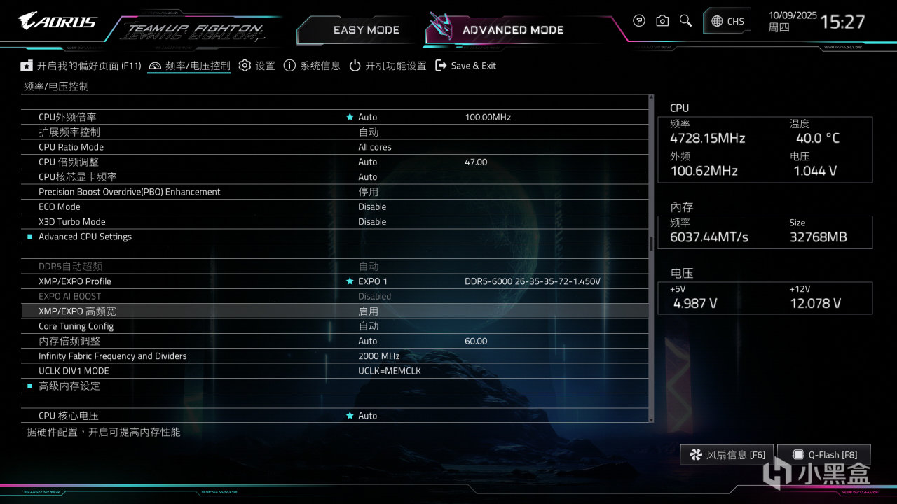 進入測試之前第一件事自然是刷至最新BIOS版本(F7d),B850M電競雕目前已支持到AMD AGESA 1.2.0.3g,看到XMP/EXPO高頻寬這一項,就是技嘉自研的D5黑科技功能,啓用後BIOS會根據當前內存狀態來進一步優化時序,達到提升內存性能的效果,通常建議是XMP/EXPO疊加高頻寬即可。