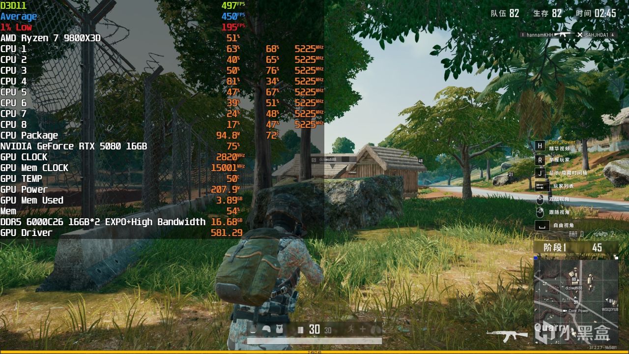 1080P《絕地求生》自定義三超高,銳龍7 9800X3D+DDR5 6000C26 EXPO+技嘉D5黑科技+RTX 5080平均幀數爲450fps,1%LOW幀爲195fps