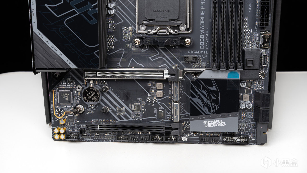 B850M電競雕擁有全方位的DIY快易拆設計,能看到M.2裝甲是帶有旋鈕的設計,而顯卡插則是搭配快易拆按鈕,一按就可拆卸顯卡。