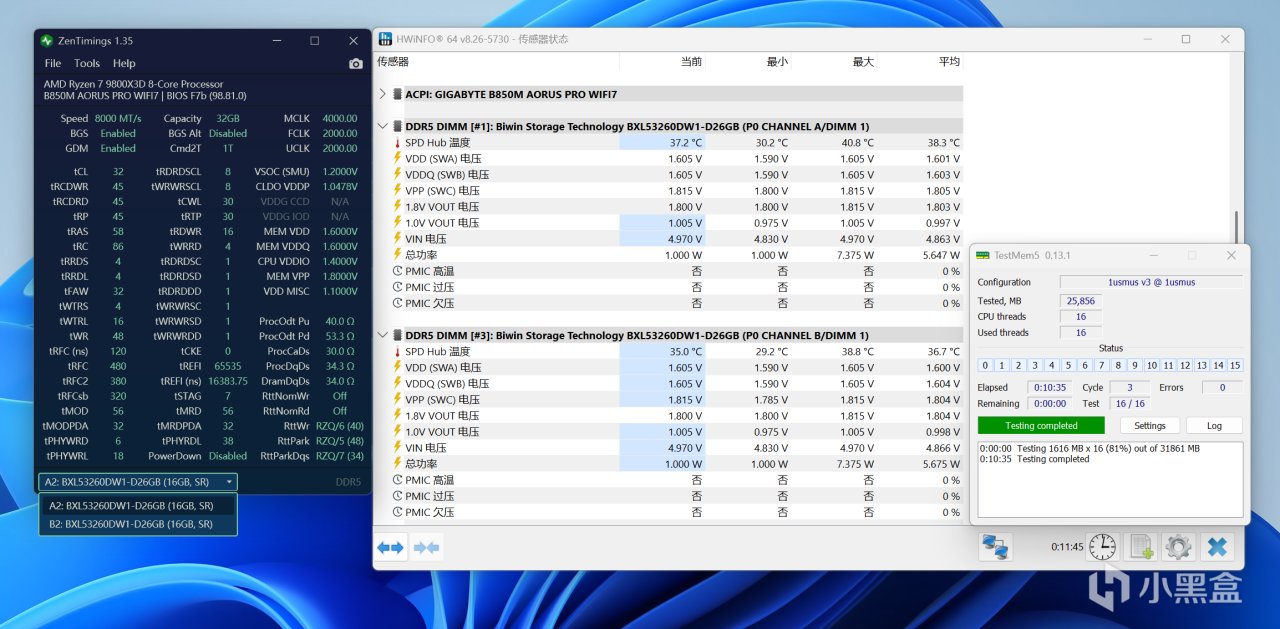 當然對於願意深入折騰的玩家,也可以試試衝擊高頻,就以銳龍9000爲例,大多數CPU體質都能達成分頻8000MHz,手上這顆9800X3D,在B850M電競雕上就可超頻至DDR5 8000C32-45-45-58,且副時序和第三時序均可縮緊,當然內存電壓得加到1.6V纔可過測烤機。
